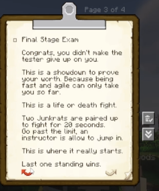 Two Junkrats are paired up to fight for 20 seconds. Go past the limit, an instructor is allow to jump in.